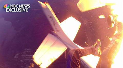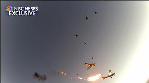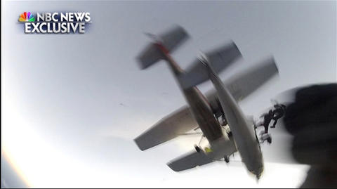 据美国侨报网报道,当地时间11月4日晚间6点半,NBC在节目中曝光了第一手的独家视频画面。11月2日晚间,两架单引擎小飞机在威斯康辛州超过3000米的高空相撞,其中一架飞机着火栽落地面。幸运的是两架小飞机上9名跳伞员及2名驾驶员不仅全活下来,并且受伤不重。