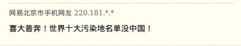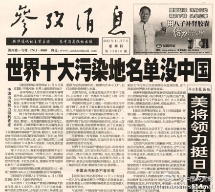 ——【新华社《参考消息》头版头条刊发了上述好消息,称瑞士绿十字会发布的2013年环境毒素报告表明,全球污染最严重的10个地方分布在阿根廷、孟加拉国、印尼、俄罗斯、乌克兰等8个国家。而由于政府解决有毒污染问题的努力,中国和印度去年上榜的一些重污染区今年就下榜了。】