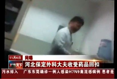 ——【河北保定第一医院大夫收受医药代表回扣的视频曝光,视频中该黑衣男子走入医生办公室锁上门,两人亲密交谈一番后,该医生开始重复上述动作,当钱数额点清后,又放进了信封,塞进了自己的抽屉里。】