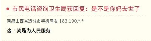 ——【一市民拨打电话到云南绿春县卫生局咨询,没想到值班工作人员不仅没接听电话,竟然还发如此短信,“问候”市民母亲。卫生局当事人解释称,当天他在家值班,将热线呼叫转移至手机,看是异地号以为是骗子,才口不择言。】