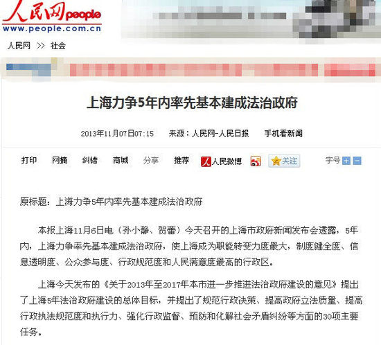 ——【上海市政府新闻发布会透露,5年内,上海力争率先基本建成法治政府,使上海成为职能转变力度最大,制度健全度、信息透明度、公众参与度、行政规范度和人民满意度最高的行政区。】