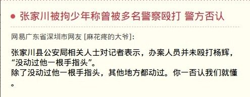 ——【张家川少年杨辉因发帖质疑一死者死因,被当地公安局以涉嫌寻衅滋事立案侦查。此事一出,争议不断。警方随后撤销刑拘,改为行政拘留7日。但没想到事件平息后,杨辉父亲又爆出上述猛料,不过当地公安局对此矢口否认,称办案人员没动过他一根手指头。】