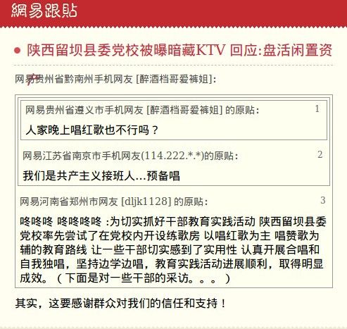 ——【网友爆料,陕西留坝县党校内暗藏豪华KTV,每个包间最大能容纳十几人。对此,留坝县委宣传部给出上述解释,称党校2012年5月将部分闲置房屋对外承包,由承包商出资改造后开办农家乐。附三间农家乐KTV练歌房,自主经营。】