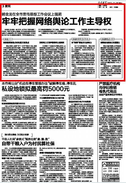 ——【《北京晚报》刊发了北京市委书记郭金龙在宣传思想工作会议上的讲话,他强调必须牢牢掌握网络舆论战场上的主导权,克服“不能管”、“管不了”的错误认识,积极采取经济、行政、法律、教育等手段,切实加强网络管理;要把宣传力量、管理力量向网上延伸,让网络空间清朗起来。】