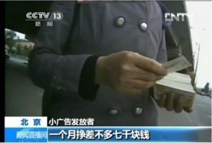 ——【这两天,“包小姐”似乎成为了全中国最知名的女性,漫天盖地的小广告让“她”一夜爆红,殊不知小广告发放者才是真正的“土豪”,据调查,在路口发名片一毛一张,熟手一天发4000张,收入400元。而贴小广告收入更高,达10元一张。一小广告发放者如此炫耀道。】