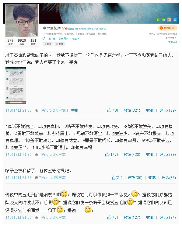 杨某本人此前的微博多为打架、抽烟等少年叛逆行为的内容,而现在,微博内容一改从前,被网友戏称从看守所出来后立刻变“公知”。也有网友怀疑其微博是否为本人所发。