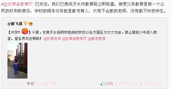 18日中午12点02分,新浪微博认证的重庆者羽律师事务所律师@游飞翥发布微博,称“【失学!】今晨,甘肃天水杨同学就读的学校以各方面压力太大为由,禁止鼠标少年进入教室。望各界关注帮助!”