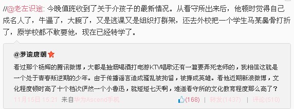 而早在11月15日,新浪微博认证为新华社记者,新浪微博社区专家委员会成员@老左识途在当天23点32分发微博表示,“今晚值班收到了关于介孩子的最新情况。从看守所出来后,他顿时觉得自己成名人了,牛逼了,大腕了,又是逃课又是组织打群架,还去外校把一个学生马某鼻骨打折了,原学校都不敢要他,现在已经转学了。”