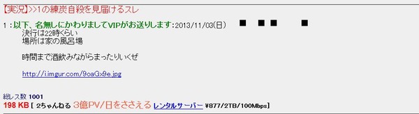 11月3日,日本冲绳县一男子在2CH上发帖直播自杀。该男子在浴室准备了2台炭炉,并在上面放上煤炭,看样子是要烧炭自杀。有网友发现情况不妙后立刻报警,但是警察赶到现场时,男子已经生命垂危,目前男子还在医院内急救。