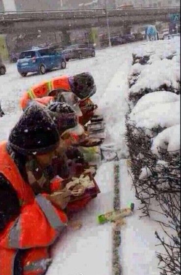 ——【东北地区连日暴雪,上万名环卫工人除冰清雪,保障城市交通正常运转。拿着不多的工资,冒着严寒风霜,有时连顿热饭都是奢望。网友贴图向环卫工人致敬。】