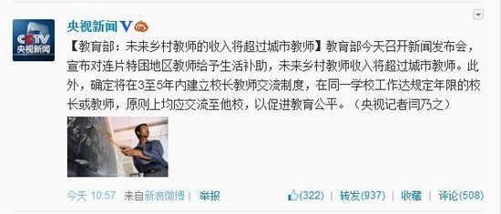 “对连片特困地区教师给予生活补助,未来乡村教师收入将超过城市教师。”