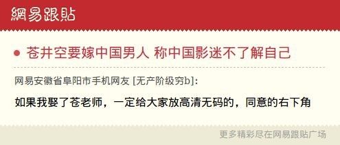 ——【苍井空做客某网络直播节目,自曝想嫁中国男人,同时还略带委屈半开玩笑地说:自己生活中其实是一位女汉子。今后将带来更多作品,让粉丝能全方位认识自己。】