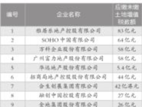 央视报道称,李劲松在对国内知名的40多家上市房地产公司的企业年报进行分析后发现,这些公司无一例外都有巨额应缴未缴的土地增值税。截至2012年12月31日,其中28家房地产上市公司应缴未缴土地增值税总额高达640亿元。应缴未缴土地增值税金额排名前十的企业分别是:雅居乐(83亿元)、SOHO中国(64亿元)、富力地产(58亿元)、万科(58亿元)、华侨城(49亿元)、招商局地产(44亿元)、合生创展(42亿港元)、融创中国(27亿元)、金地集团(26亿元)、新世界中国地产(24亿港元)。