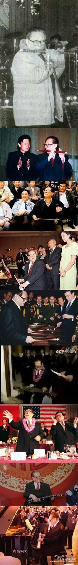 大学时代,江的同学们演出小品剧时,江便给他们拉二胡伴奏,而在他任总书记后,他也没忘了这陪伴他一生的传统乐器,在其应金日成之邀访问朝鲜时,随身带的行李中,就有一把二胡。访问期间,偶得宽余,江就兴致勃勃地拉上一阵。98年克林顿访华时,欢迎晚会结束后,江兴致盎然地从演员手里拿过二胡,拉了一曲美国民歌《稻草里的火鸡》。这次演奏不是江心血来潮,而是赴了五年之约,93年中美两国领导人某事之后在西雅图峰会第一次见面,江以音乐打破了尴尬,克林顿曾是萨克斯管业余乐手,江特地送了他一件中国制造的萨克斯管。江说,他也爱好音乐,但不会吹萨克斯管, 却会拉二胡。克林顿笑着说,“将来有机会,我吹给你听听。江立即回答,我可以拉二胡伴奏。