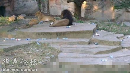 比如上海新闻晨报:【游客们,别扔了……】报导说:国庆第一天,人头攒动,观者如织。上海动物园许多动物馆内到处是游客扔的塑料水瓶,我数了一下,狮子馆里至少有70个以上。我就亲眼看到,两个游客嫌弃狮子老迈不动弹,把水瓶扔在狮子身上。