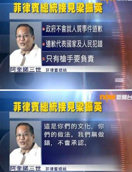 ——【菲律宾总统阿基诺三世在APEC会议期间会见梁振英,他表示不会就2010年的香港人质事件致歉。如果菲方道歉了,就等同承认国家、政府和人民犯错了。】