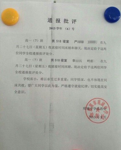 ——【日前浙江慈溪市观城中学高一两对男同学因同床共寝,受到全校通报批评处分。】