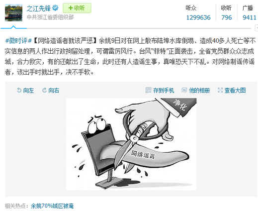 ——【10日,浙江省委组织部官方微博发声称,在全省党员群众众志成城,合力救灾之际,有人却在网上散布水库倒塌、造成40多人死亡等不实信息,真是唯恐天下不乱。余姚行政拘留造谣者,可谓雷厉风行。】