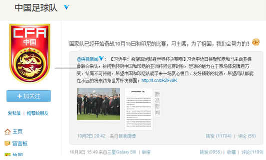 ——【针对国家主席习近平在印尼出访时再次表达的对中国足球队打进世界杯决赛圈的愿望,中国足球队做出了积极回应,他们在官方微博上立下誓言,称已经开始备战10月15日和印尼的比赛,为了祖国会努力的。】