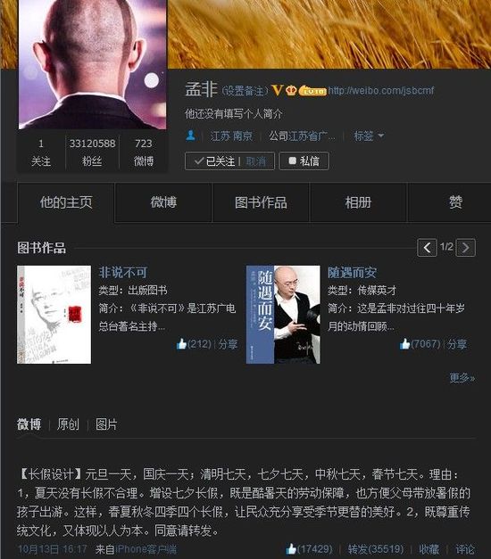——【13日,著名主持人孟非在其认证微博发表了一个“长假设计”,认为夏天没有长假不合理,增设了一个七夕长假。这样,春夏秋冬四季四个长假,让民众充分享受季节更替的美好。既尊重传统文化,又体现以人为本。】