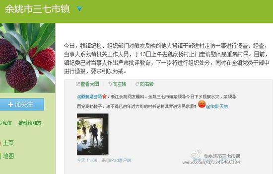 ——【14日,有网友反映,浙江余姚三七市镇某领导下乡视察水灾,因穿高档鞋子,由年近六旬的村书记将其背进灾民家里。对此,三七市镇回应称当事人系该镇机关工作人员,当时是上门走访慰问患重病村民。镇纪委已对此事作出处理。】