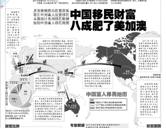 以2011年为例。中国对世界几个主要的移民国家永久性移民数量超过15万人,其中在美国获得永久居留权的人数达87017人,在中国国际移民总数中排名第一,其次是加拿大、澳大利亚和新西兰。“赚中国的钱做外国的公民”成为外国媒体的常用词。欧美国家经济低迷,出招吸引中国投资移民,“抢钱又抢人”。