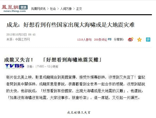 据台湾TVBS报道,新片在北美上映,影星成龙亲自到美国宣传,接受外媒专访时,没想到又失言了。当记者问到美中关系时,成龙原意是要说,很喜欢看到全世界一起合作的感觉,没想到话说的太快,他却说成:“好想看到有些国家,出现大海啸或是大地震的灾难”,他还说:“如果没有海啸没有地震,大家没事作,就会吵架”,这一席话,又引起一片哗然。