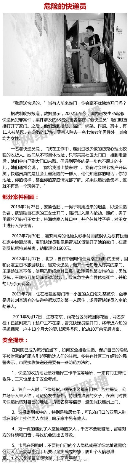 【你是否有这个危险习惯:快递员一敲就开门?】"我是送快递的。"当有人来敲门,你会毫不犹豫开门吗?2002年至今,国内已发生35起假快递员犯罪案件,案件涉及的63名受害者都在"假快递员"敲门时直接打开了家门,其中11人被害身亡。在网购已成流行的当下,你知道如何保护自己吗?