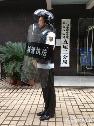 半个月前,广州城管高调向小贩宣战,将流动商贩视为“敌人”的斗争思维“霸气侧露”。近日,斗争思维仍在继续,城管似乎在宣示自己是不可战胜的。记者探营发现,广州城管执法人员一共有“六件套”护身,包括由7块钢板组成的防刺衣、2毫米厚的防护手套、前后包围的防护头盔、采购材料制成的防护盾牌、覆盖全市范围的全频加密对讲机,还有一个全国首创的自动胸挂摄像头。