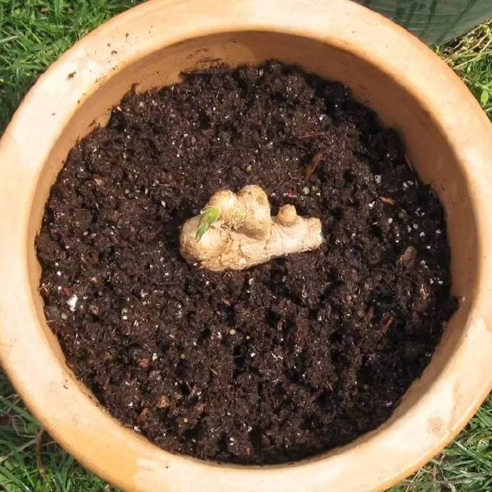 将发芽的生姜种植在花盆里面,用土盖住一大半姜身,一次性浇水浇透,到芽冒出来前都不用再浇。