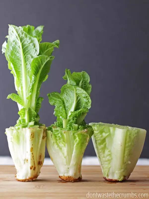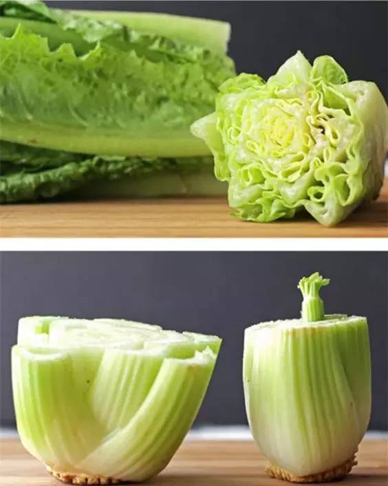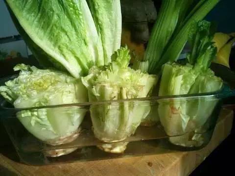 将生菜根茎放置到盛水的容器里,水位以刚漫过根部最合适,即1厘米左右。很快生菜就长高长大了。