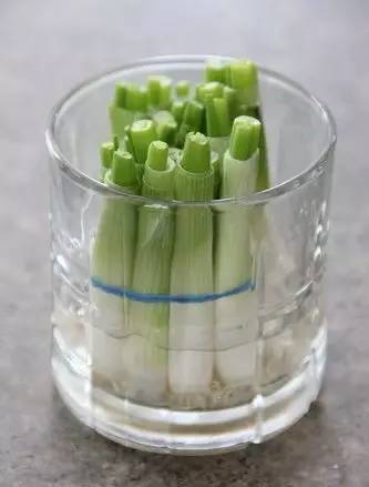 将葱的根部自茎叶泛青的位置切开,用橡皮筋捆扎在一起,放在3厘米高的水杯里。