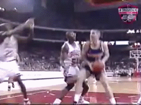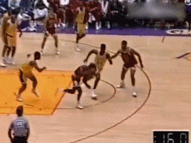 乔丹跳得老高从队友头顶摘下篮板,结果却滑倒并脱手了,为了救球,乔丹用屁股在地上滑翔,最终球还是出界了。。。