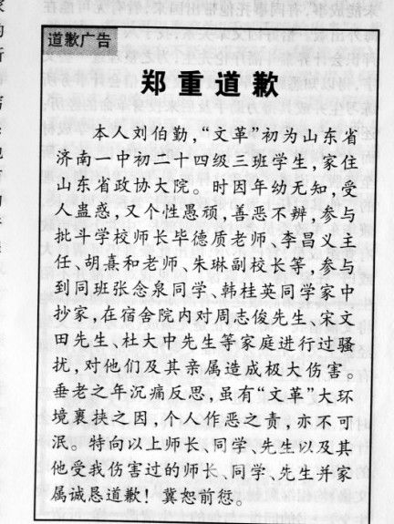 ——【当年的“红卫兵”、61岁的刘伯勤登报向在“文革”中受到自己批斗、抄家的师生邻里道歉。】