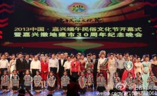 ——【近日,在2013中国·嘉兴端午民俗文化节开幕晚会结束后,嘉宾和表演者合影留念,而最前面的孩子们却是跪着面对镜头。网友质疑:是谁让孩子们下跪的?】