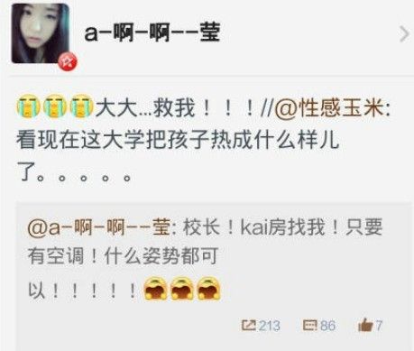 ——【天太热,网友“a-啊-啊--莹”微博称只要有空调,校长开房请找她。随后她真的收到一位校长的回复。】