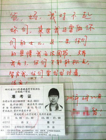 ——【四川女孩因复读一年后差本科线6分,选择了割腕、喝农药结束生命,给父母的遗书上写“来世还做你们的女儿”。】