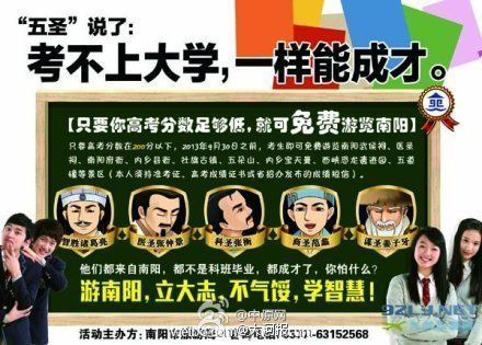 ——【河南高考分数线昨天公布后,为使低分学子尽快走出情绪低谷,南阳市旅游局承诺,高考分数在200分以下的考生可免费游览9家景区。媒体对此评论。】