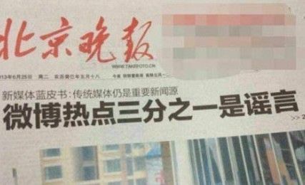 ——【北京晚报头版头条《微博热点三分之一是谣言》引发网友热议,深夜22点57分,人民网舆情监测室怒斥标题不准确。今日,微博也“处理”了这一谣言。】