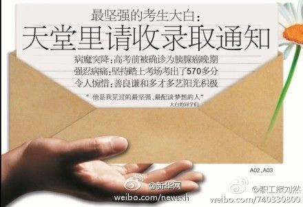 ——【沈阳男孩高考前被查出胰腺癌晚期,父母为免其思想负担对其隐瞒病情,男生在最后一门英语考试因剧痛没有完成的情况下仍考了570多分,老师含泪赞其坚强。】