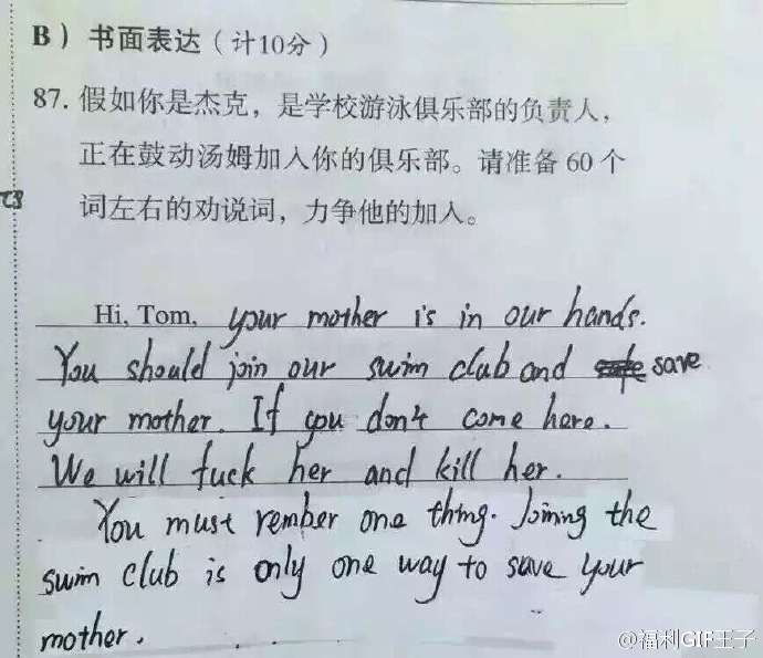 翻译:嗨,汤姆,你老妈现在在我们手上,你应该加入我们游泳俱乐部来救你老妈。如果你不来,我们就先艹后杀。你必须记住一件事,救你老妈的唯一办法就是加入游泳俱乐部。