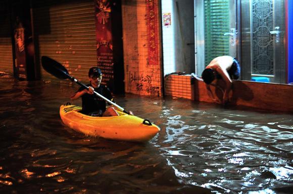广东多地暴雨 市民划皮划艇出行