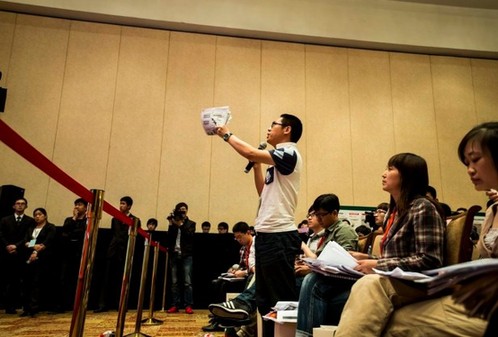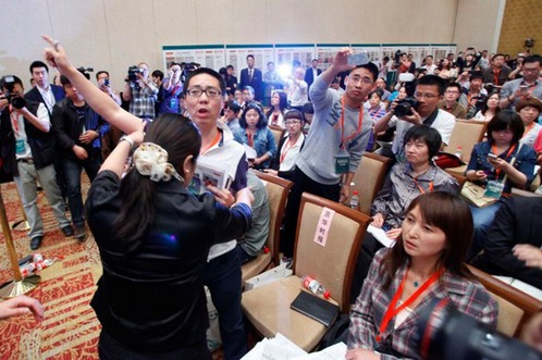 京华时报一位男记者站立起来,并回应说是农夫山泉不愿接受采访,并不是他们没有采访农夫山泉。图为京华时报记者激烈质问农夫山泉,被人喊“滚出去”。
