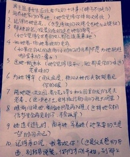“1、站在她家门口等她;2、记得给她送花;3、帮她拎包,假装自在的走在她的身旁;4、和她看一场她喜欢的电影;5、送她一瓶花果味的香水;为她撑伞。陪她逛一次公园,看看花花草草和公园里白发的老夫老妻;8、睡前问候她,看到她回复再入睡;9、她透不过气时,离开她,等着她;10、记得亲口说:我喜欢你!”