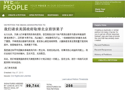 “我们请求美国政府取缔北京煎饼果子!”9日,美国白宫供民众向政府表达意愿的请愿网站“我们人民”出现了这样一则中文“请愿”内容。最近几天来,该网站多次出现疑来自华人的请愿,不少内容很无厘头。