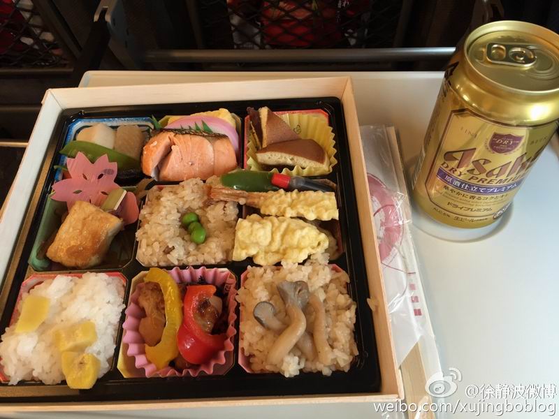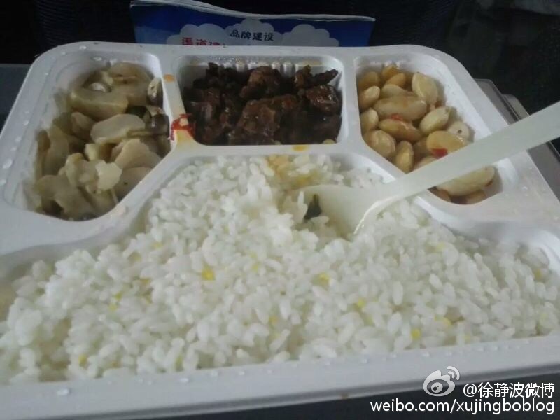 @徐静波微博:我刚发了一张在日本新干线上的盒饭照片,正在上海前往北京高铁上的网友立即给我传来了他在高铁上刚买的盒饭。有趣的不在于盒饭的味道,而是两者的价格:日本新干线盒饭是900日元(约50元),中国高铁这一盒饭也是50元.