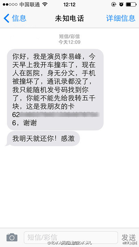 演员李易峰今天凌晨撞车后,诈骗分子也顺势出动,以李易峰的名义“借钱”。