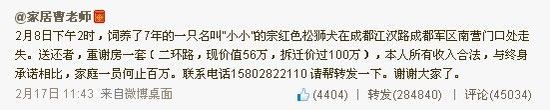 ——【认证网友“家居曹老师”微博寻狗,称其养了7年的松狮犬“小小”走失了,他承诺将赠送还者百万房产。网友纷纷表示,不干活了,找狗去!】