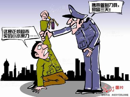 其实要说起来,菜刀比那把水果刀要长多了,更属于管制刀具吧,而且大街小巷到处有得买,菜刀的危险性恐怕比水果刀更大,这样来看,我们所有的市民都面临坐牢的危险了,因为家家都得买菜刀,买了菜刀就得带在身上拿回家吧,万一被警察看到,岂不要坐牢或罚款了?是不是以后法律增加规定,公民买菜刀前要先去公安局备案,获得批准后,后手持公安批文采购,然后才能安全回家呢?这样多好,元朝时五户才能有一把菜刀,今天似乎也可以照搬采用,于是社会就和谐了呵。