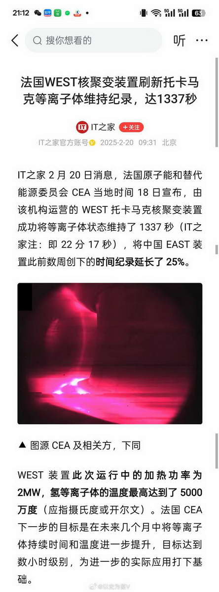 于是仔细看了一下新闻,原来法国人搞得核聚变氢等离子的温度才到 5000 万度 °,烧了 1337 秒;